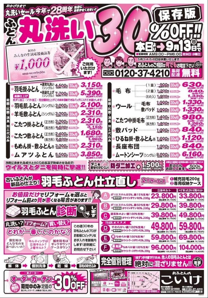 ふとん丸洗い30%OFF&羽毛ふとん仕立て直しセール