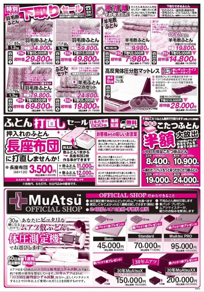 こいけオリジナル羽毛ふとん ムアツ スリープスパ オーダーまくら おひるねふとん パシーマ クリーニング・メンテナンス お店紹介 特売情報